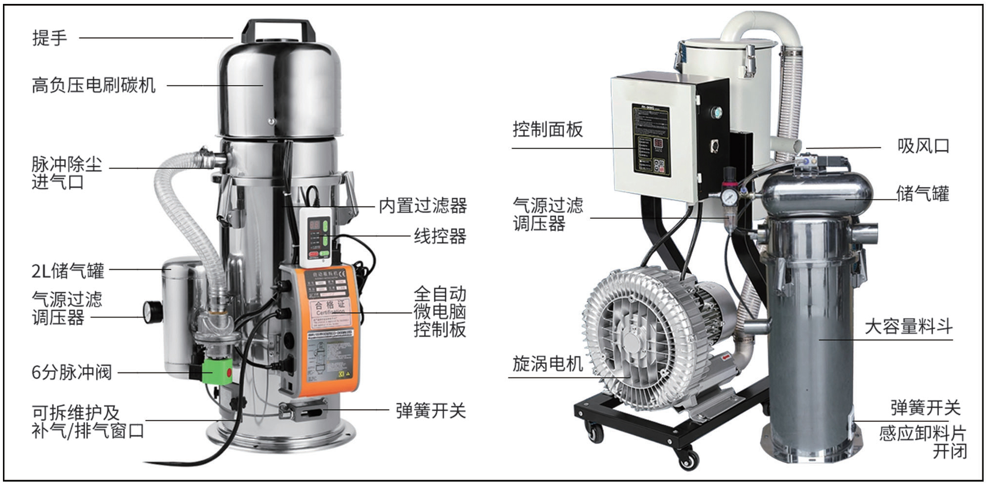 不锈钢储气罐:配合脉冲程序,有效震荡、清理滤布上的粉尘,防止因为滤芯堵佳而影响上料;